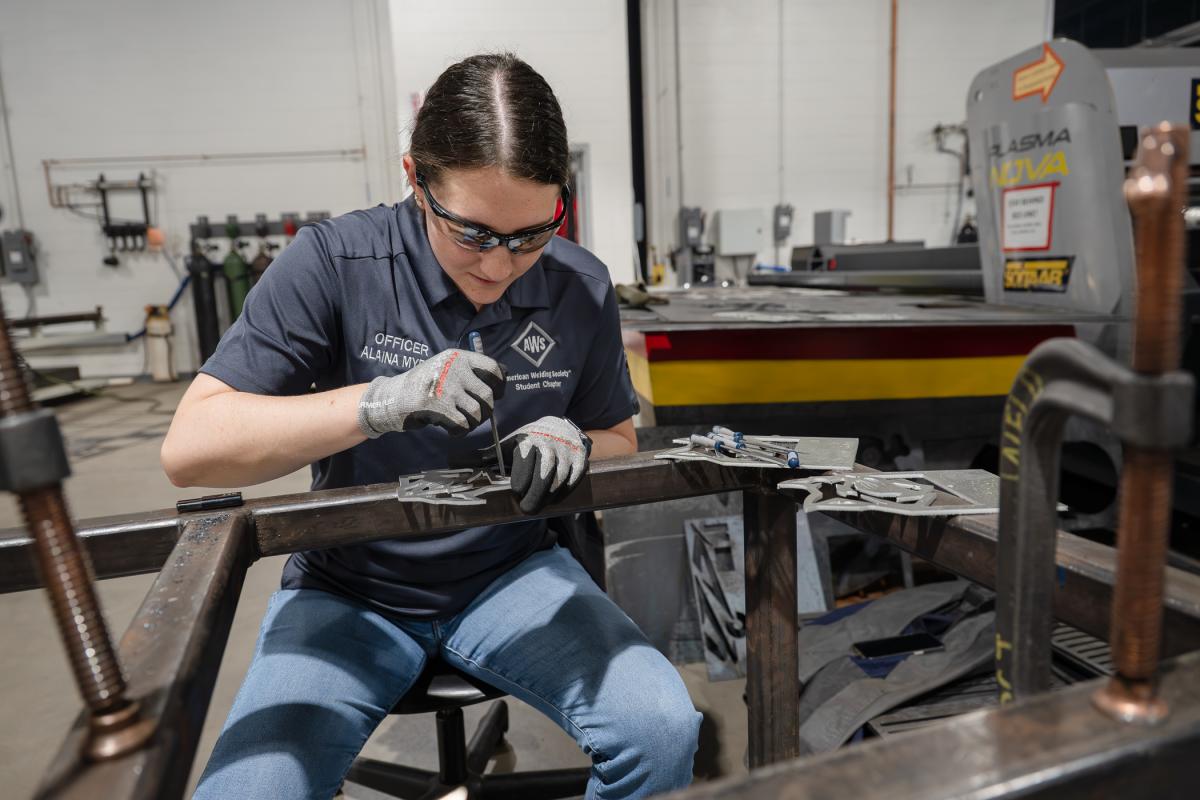 Alaina S. Myers, a welding & fabrication engineering technology student from Hanover, files metal Wildcat logos during a “Labs in Action” demonstration. Myers is part of the college’s American Welding Society student chapter, which set up a table to greet students in the Lycoming Engines Metal Trades Center.