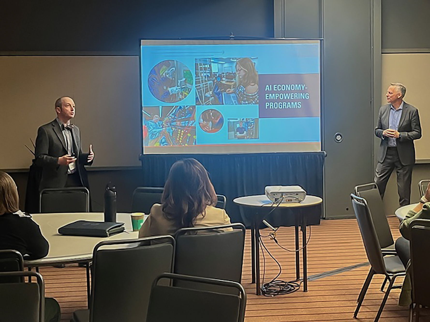 Reed and Webb identified three pillars of the AI economy – core infrastructure, enabling industries and AI delivery – before relating how Penn College programs serve as a conduit to rewarding careers in the sectors. They did so by showcasing some of the college’s 150-plus learning labs, revealing the influential role played by over 4,000 industry partners and citing alumni excelling in the fields of on-site power generation, software development and networking, and building automation.