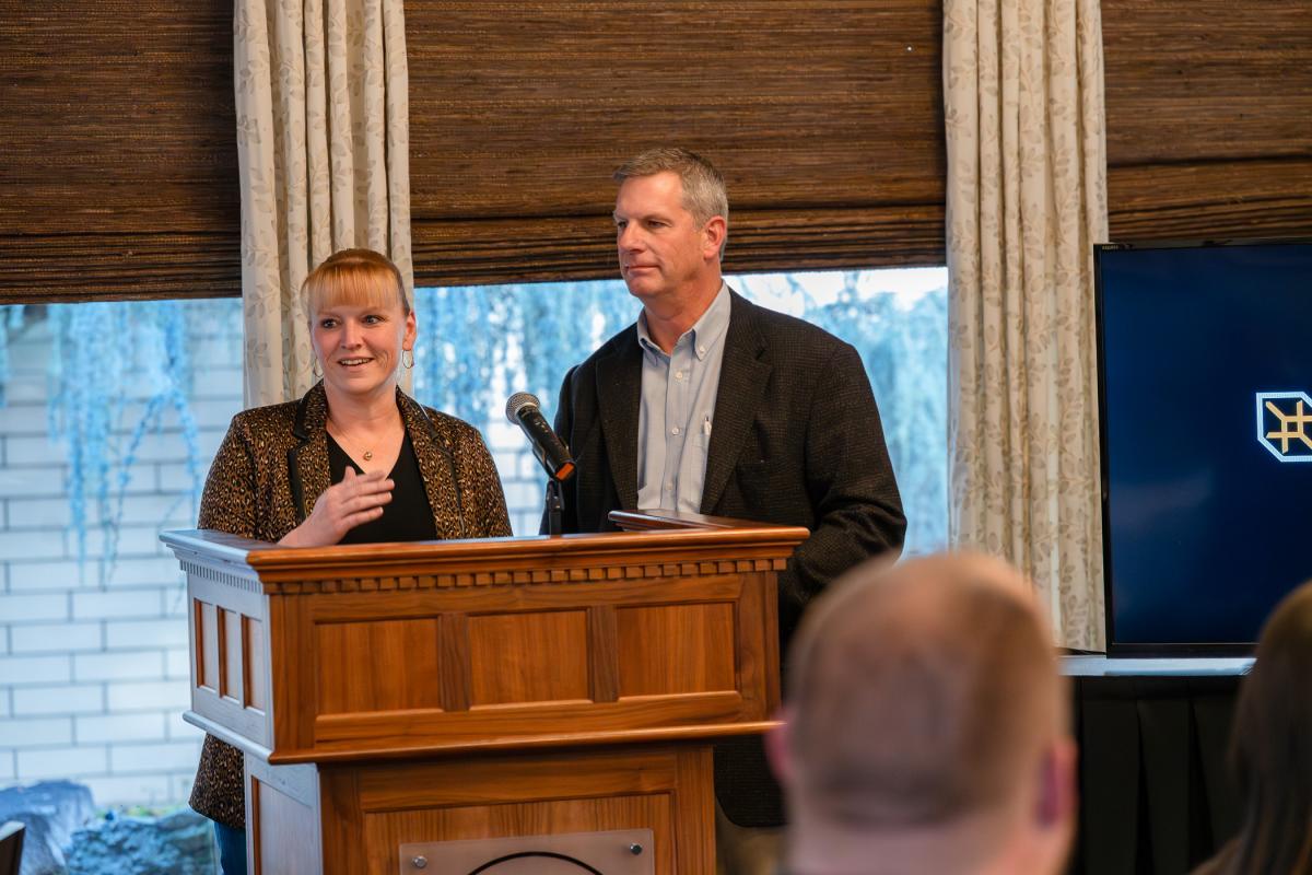 Kristie Healy, joined at the podium by husband Ken, discusses her interest in supporting Williamsport LaunchBox.