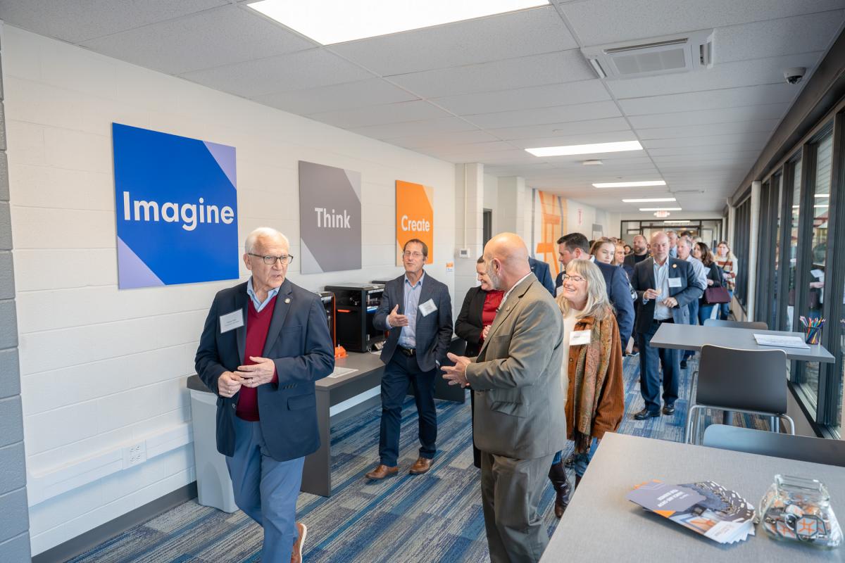 Attendees – including State Sen. Gene Yaw (left), chair of the Penn College Board of Directors; Jason Fink (second from left), president of the Williamsport/Lycoming Chamber of Commerce; and Vilello – stream through the facility, which provides space for meeting and coworking.