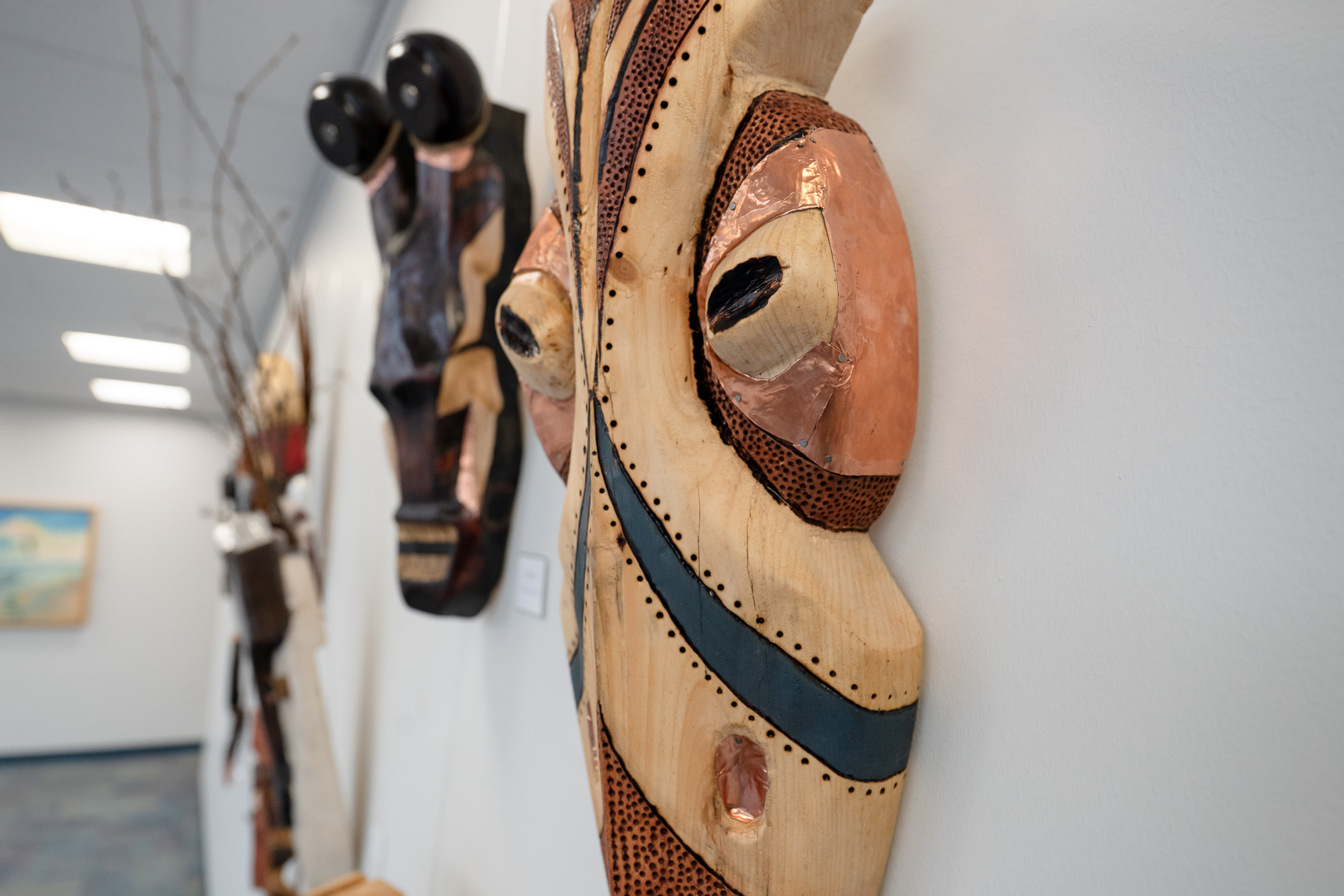 Using only basic tools, such as gouges and mallets, the class carved their designs by hand over several weeks, gradually transforming pine blocks into expressive sculptural masks. The finished works were sanded and embellished with metal accents, nails and stains to highlight contrast and texture.