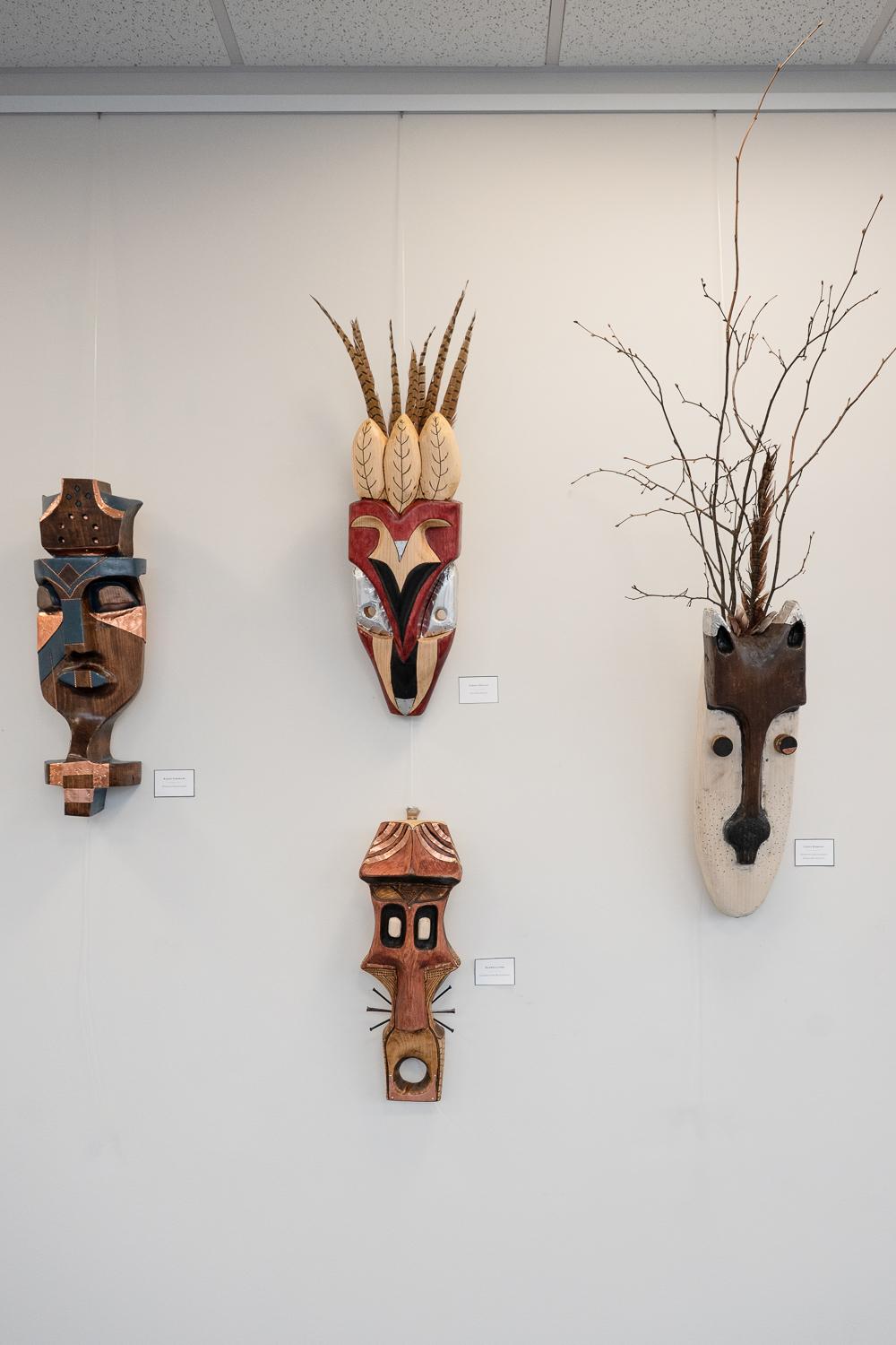 Hand-carved African masks, made by students in Mark W. Wilson's Wood Sculpture class, are on display until mid-December on the second floor of the Madigan Library.