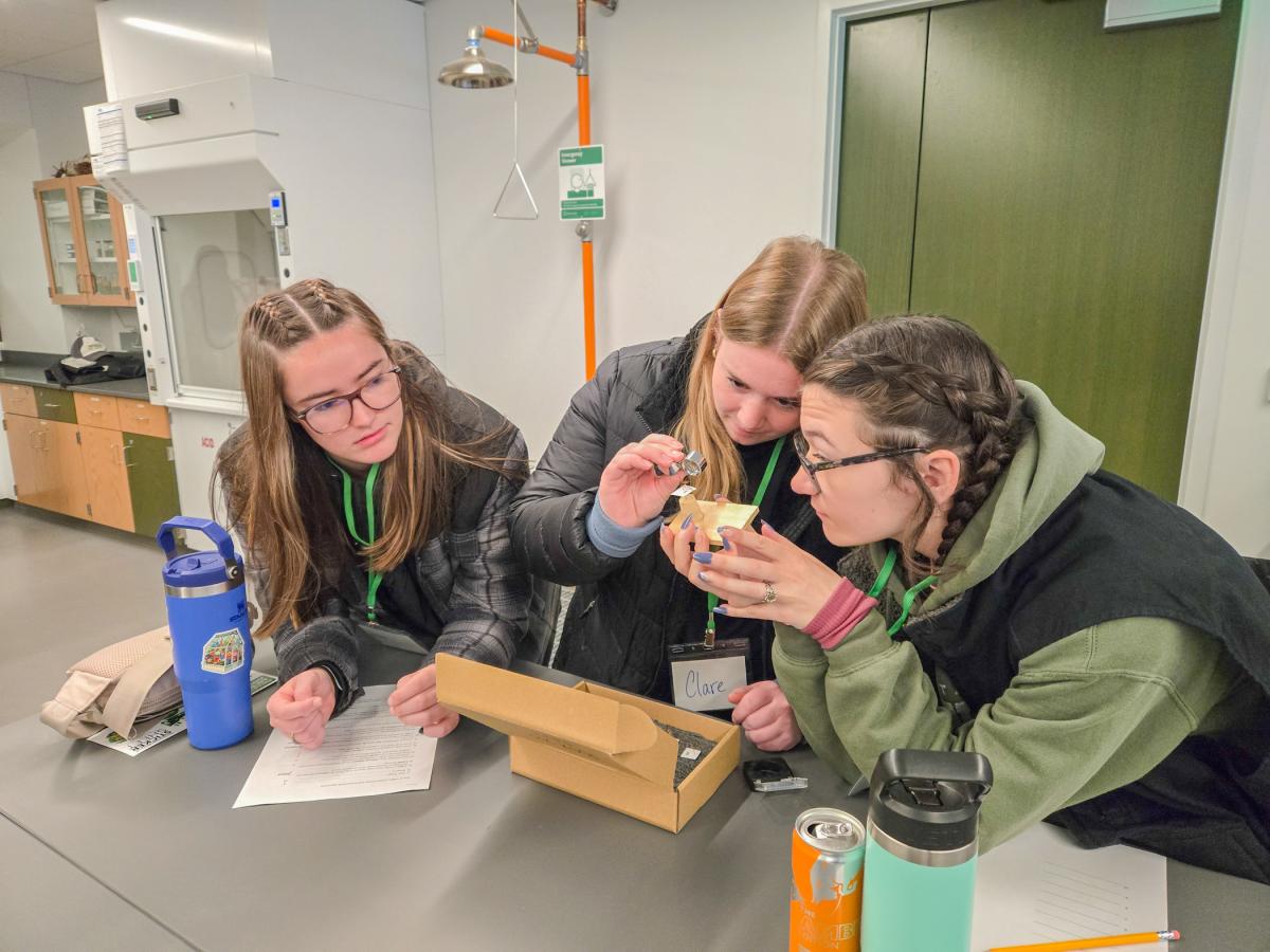From left, Katie R. Boyer, of Middleburg; Clare E. Allen, of Stevensville; and Katelynn S. Sauers, of Millmont, all landscape/plant production technology students, examine an insect in Davey Tree’s diagnostic lab.