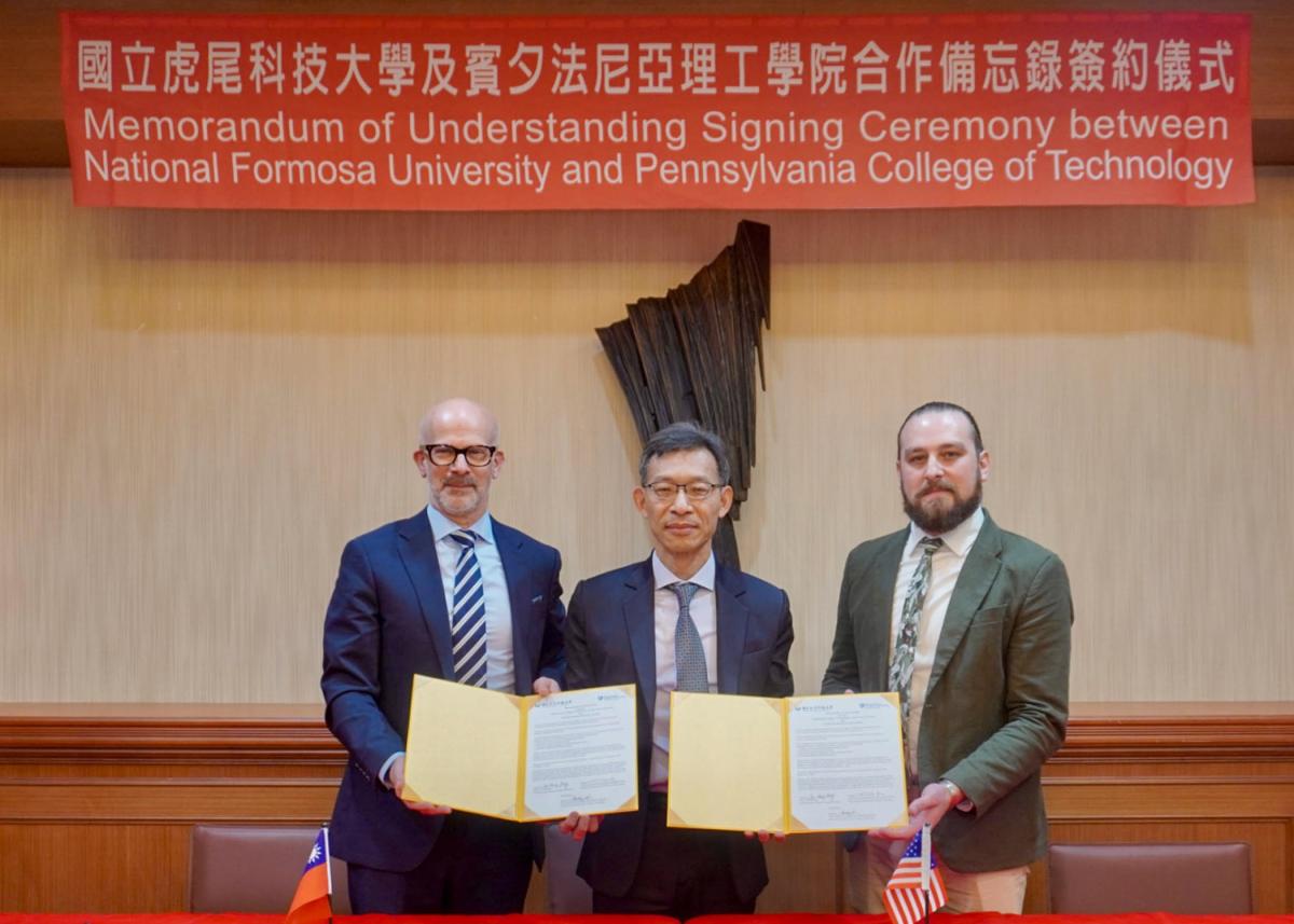 From left, Patrick Marty, chief government and international relations officer at Pennsylvania College of Technology; Jau-Shiung Fang, vice president of National Formosa University; and Anthony J. Pace, Penn College’s vice president for enrollment & academic operations, hold the institutions’ memorandum of understanding signed recently in Taiwan. The MOU calls for the two schools to explore several collaborative opportunities. (Photo by National Formosa University)