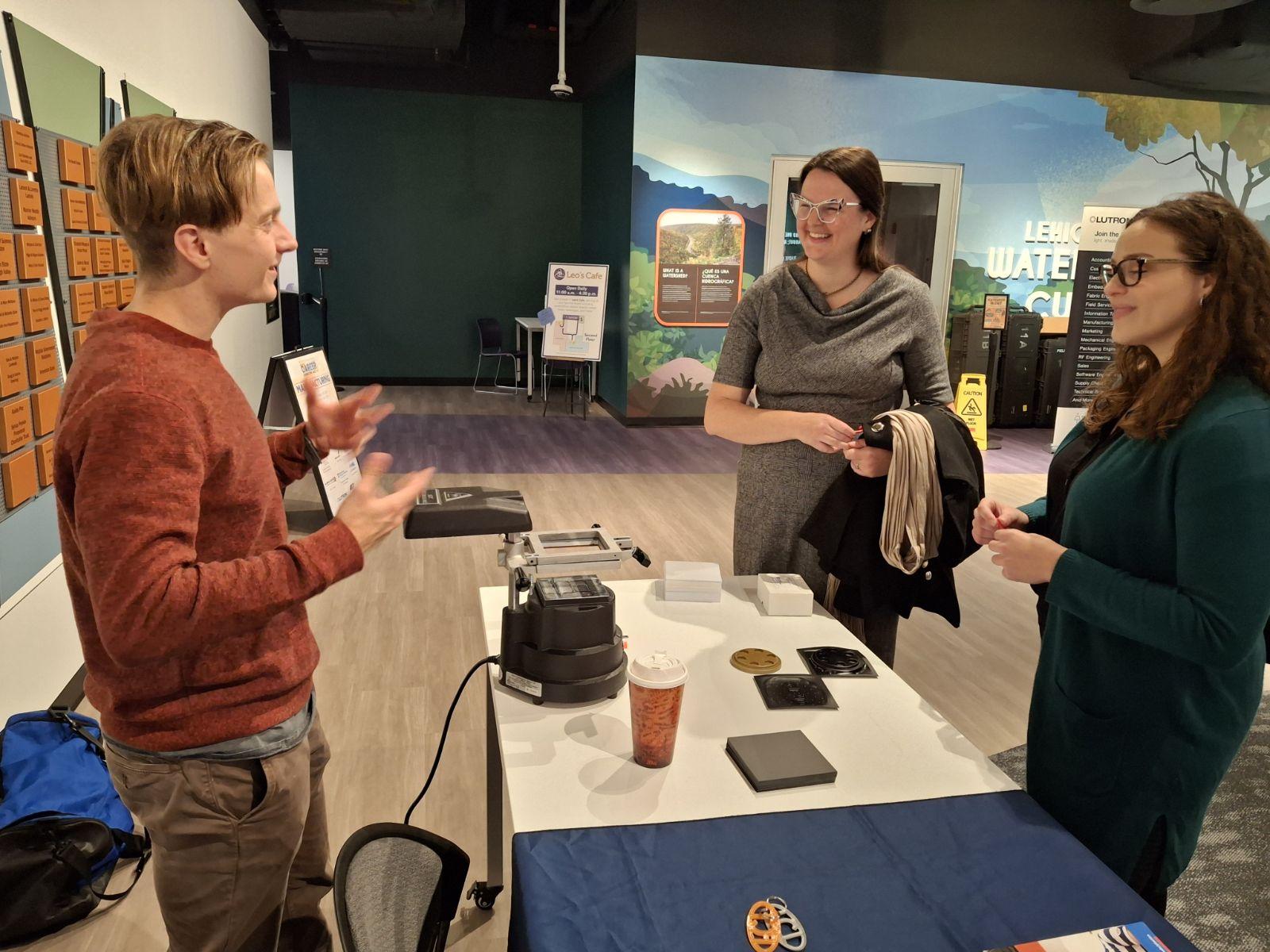 Reagan G. McCoy (left), Penn College Workforce Development program manager, polymers, talks with Kate Hartney (center), director of development for the Da Vinci Science Center, and Sarah Lutz, assistant executive director of Workforce Board Lehigh Valley during the Da Vinci Science Center’s Manufacturing Career Connection Day in Allentown.