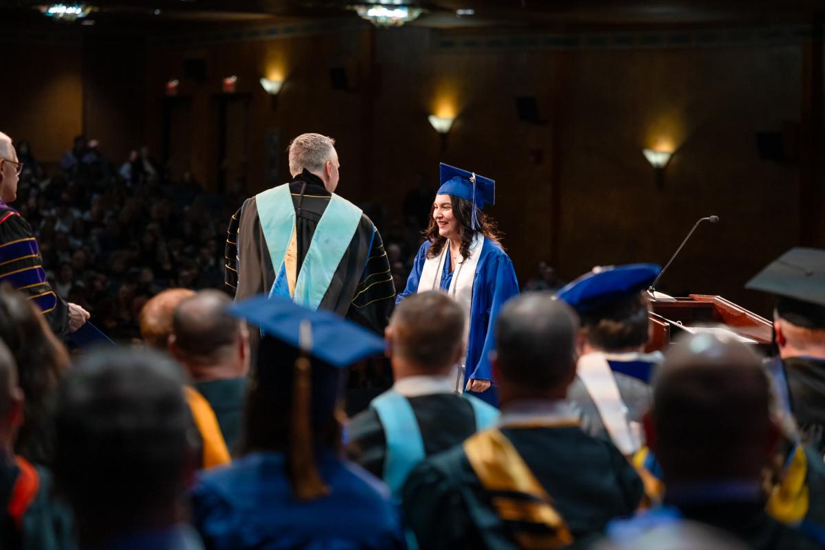 Reed congratulates graduates as he exits the Arts Center, exchanging a fist-bump with Maddi H. Smith, of York, who completed degrees in culinary arts technology and applied management.