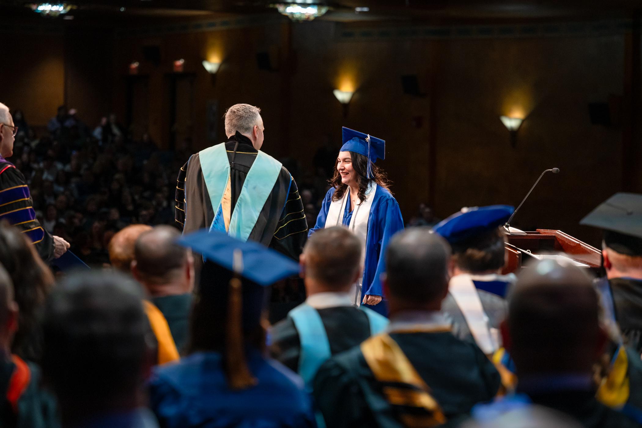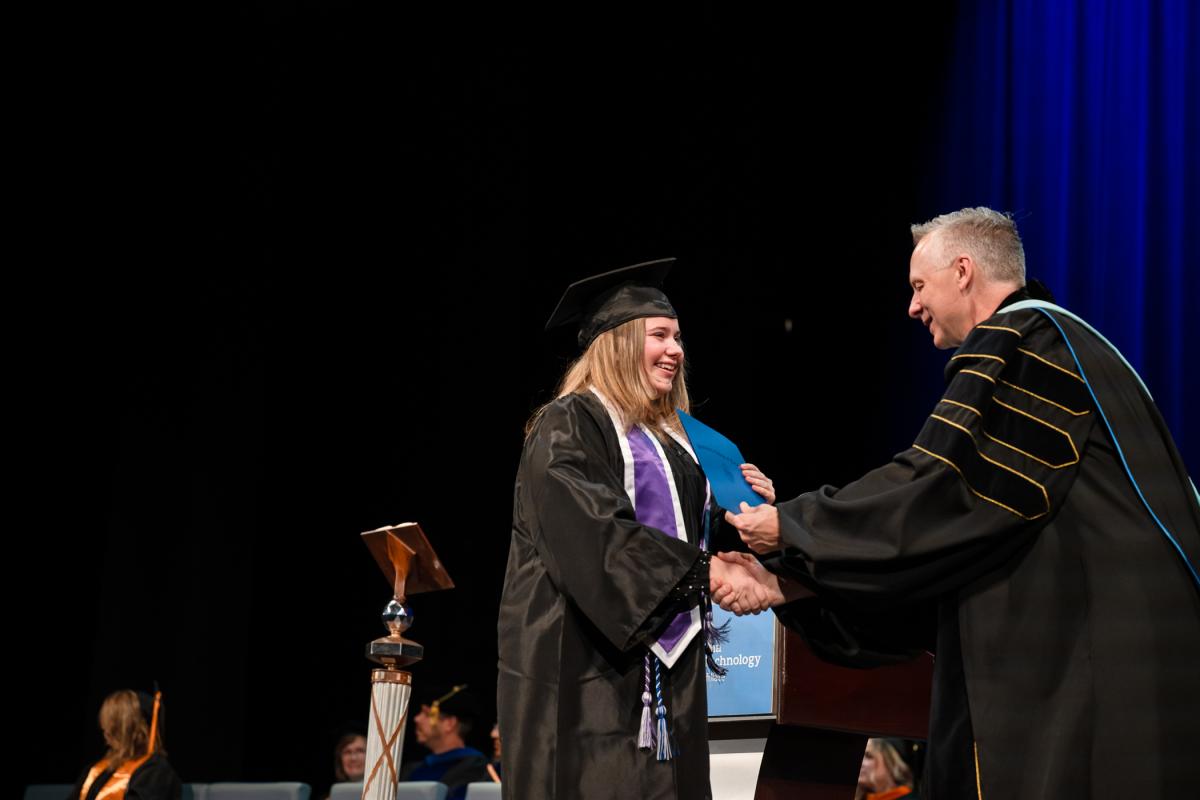 During Penn College’s Fall Commencement ceremony on Dec. 20, President Michael J. Reed congratulates Angelina K. Mendez, of Cogan Station, who completed an associate degree in human services & restorative justice.
