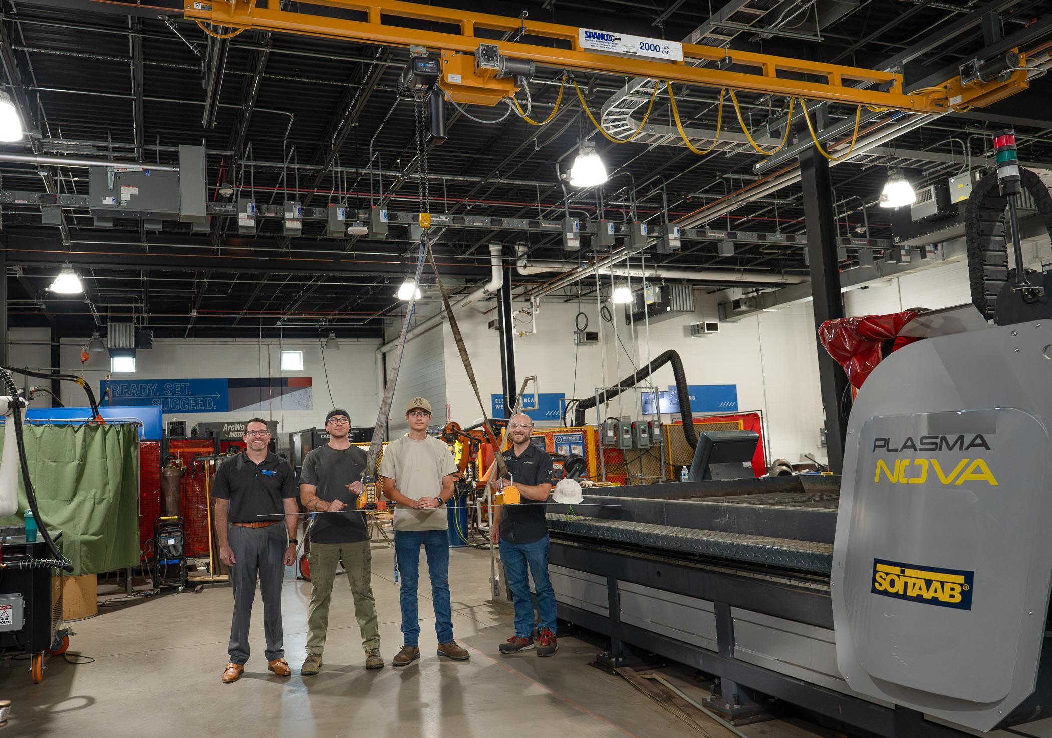 The crane is located above a Soitaab computer numerical control plasma cutter in the portion of the welding lab dedicated to automated technology.