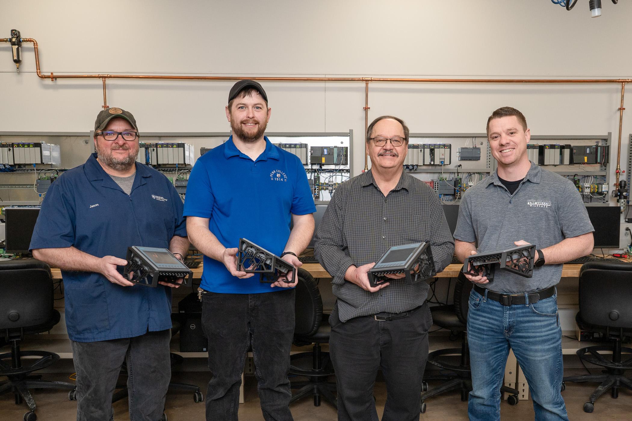 The Pennsylvania College of Technology team responsible for designing and manufacturing plastic frames to hold Siemens human machine interfaces display their creations in the college’s automation and robotics lab. From left: Jason A. Yorks, maintenance mechanic/millwright specialist; Bryan Schaefer, instructor of CNC machining & automation; Randall L. Moser, assistant professor of electronics & computer engineering technology; and Luke J. Davies, assistant professor of CNC machining & automation. The 3D-printed frames – in the shape of a rectangular trapezoid – position the HMIs at a 45-degree angle and feature Penn College branding.