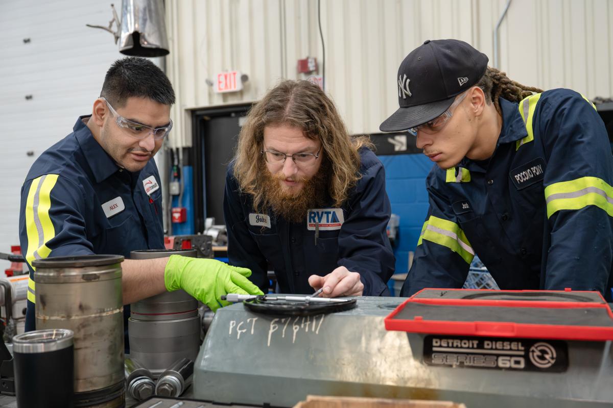 Jake Dame (center), of River Valley Transit, and fellow apprentices from Rabbit Transit and Pocono Pony check a measurement.