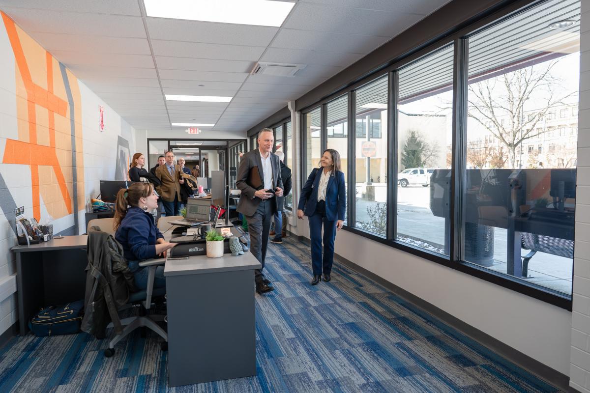 President Michael J. Reed escorts Walker through the Williamsport LaunchBox supported by Ken and Kristie Healy. The LaunchBox is in the college's Carl Building Technologies Center.