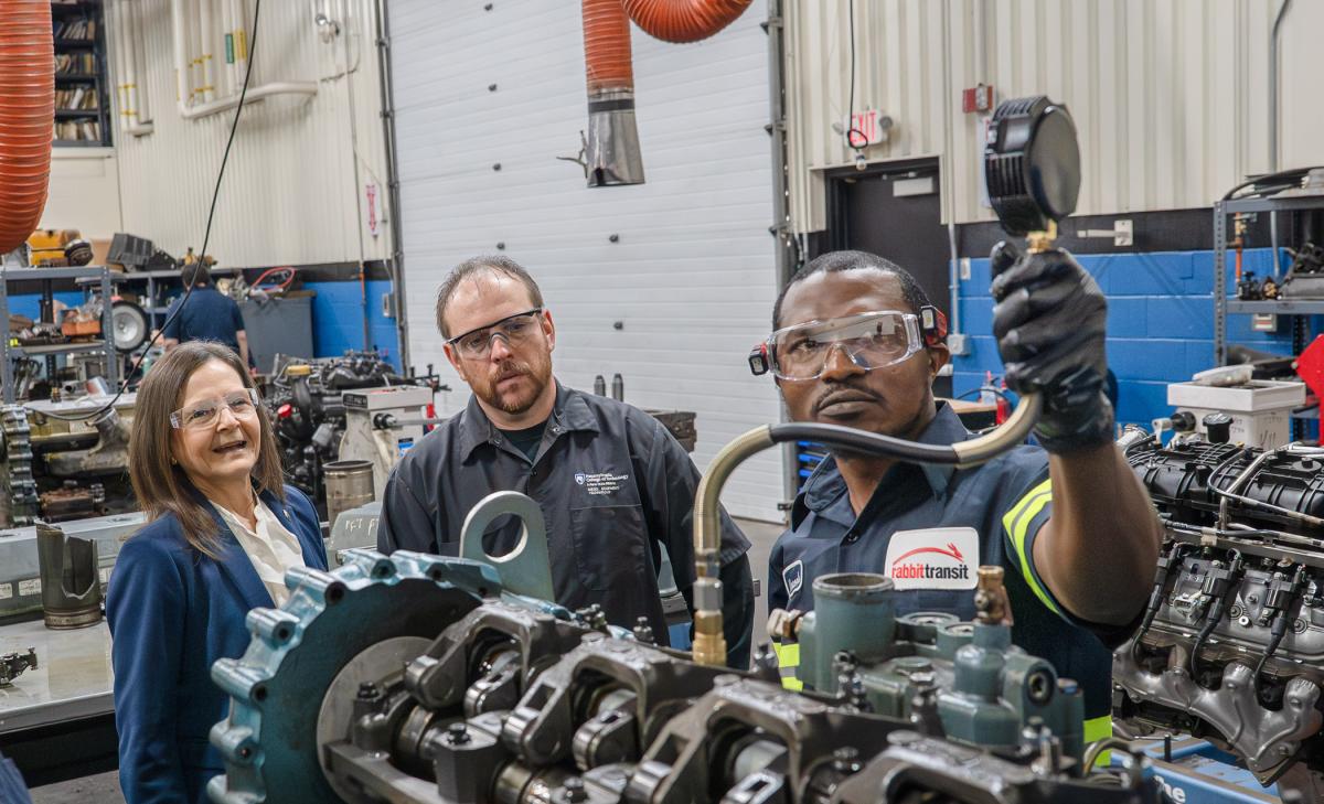 An employee of rabbittransit, who is also a participant of Penn College Workforce Development's Bus Maintenance Technician Apprenticeship, demonstrates what he has learned as Secretary Nancy A. Walker, Pennsylvania Department of Labor & Industry, and Jeremy R. Bell, instructor and co-department head of diesel technology, look on.
