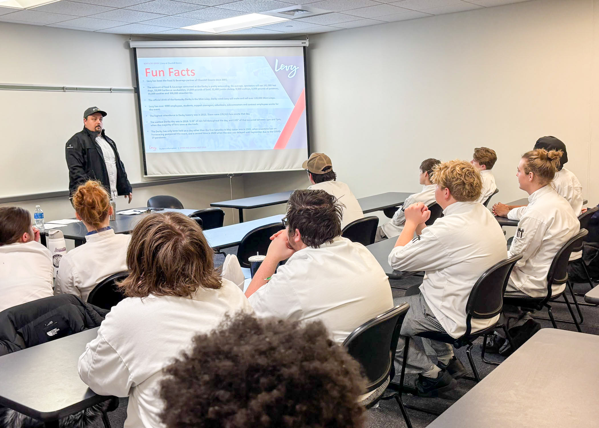 Officials from the company visited Penn College last week to interview and select the students who will be paid interns at the 152nd running of the Kentucky Derby, set for May 2 at the famous thoroughbred racetrack. Chef Robert Lopez, senior executive chef; Chef Kermit Gibbs, banquet chef; and Harry Moore, director of human resources, delivered an overview of Levy and the Derby experience to baking and culinary students before spending a full day conducting interviews.