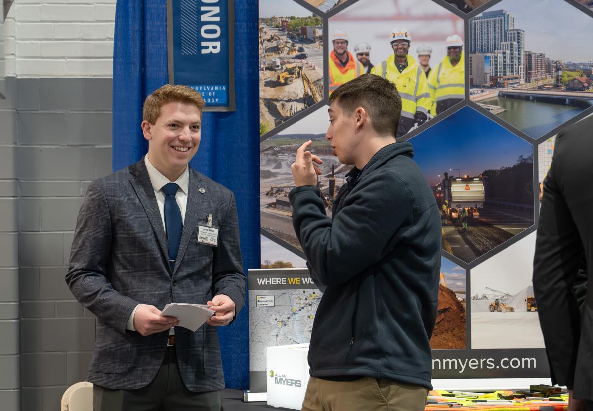 Jason Wiedl (left), a construction management student from West Pittston, engages with 2025 construction management graduate Chris Fisher, representing Allan Myers Inc., a Corporate Tomorrow Maker and the largest civil construction company and materials provider in the Mid-Atlantic.