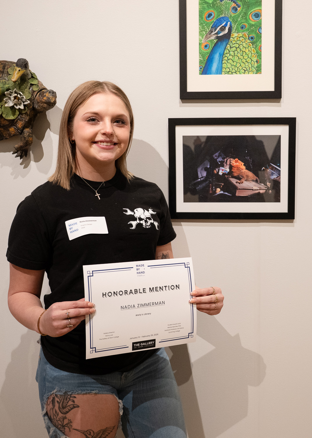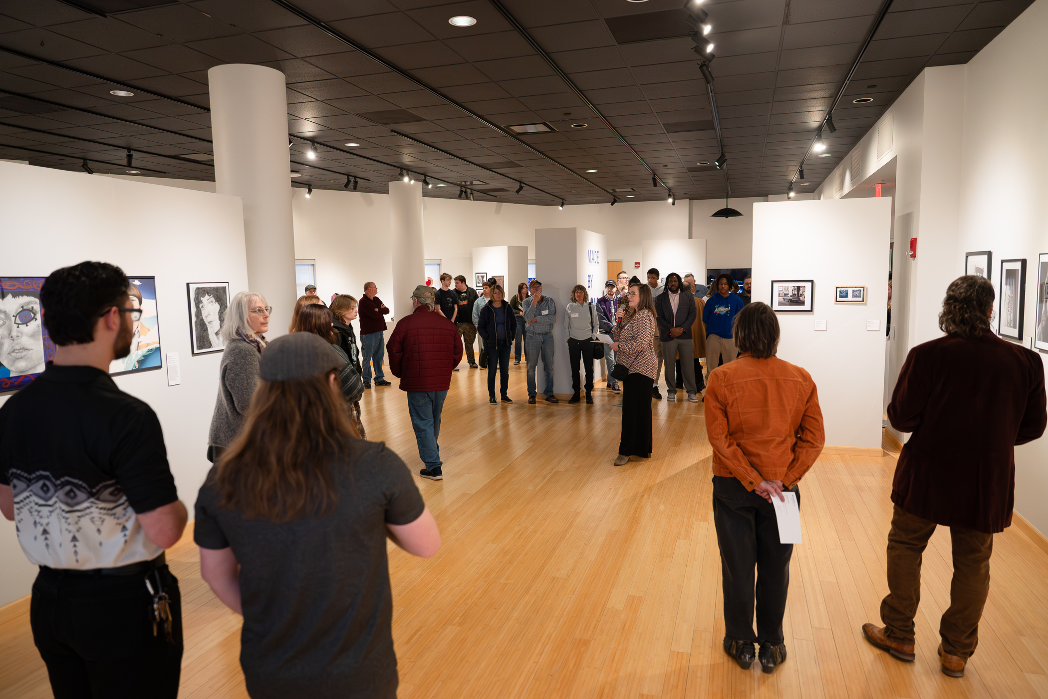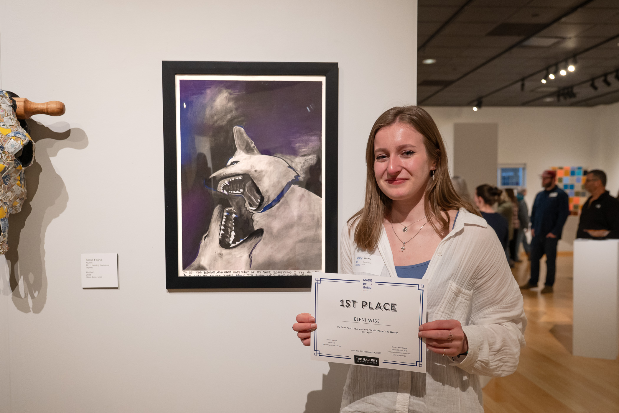 Nearly 150 people attended the closing reception of “Made by Hand: An Exhibition of Tomorrow Makers.” The exhibit celebrated the creativity, skill and artistry of the college community with more than 110 pieces of art from 75 students, alumni, retirees, faculty and staff. Marking the 20th anniversary of The Gallery at Penn College, the show featured a wide variety of styles and media.