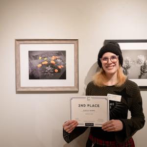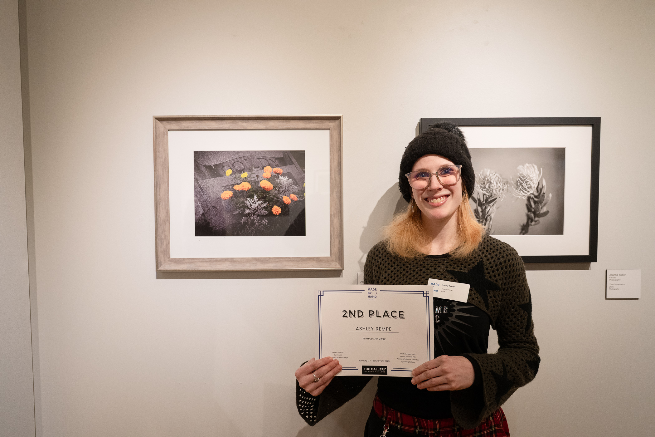 “As a member of the gallery committee, I was so excited by the idea of a show that could bring together students, faculty and alumni to celebrate our creative community,” said Joanna Yoder, instructor of photography. “‘Made By Hand’ became exactly that – a beautiful conversation across generations. I was truly blown away by the work submitted. I’m deeply proud of everyone who chose to share their art. It takes real courage to put your work on a gallery wall, especially for students who are still discovering their voice as artists. Watching them support one another, critique thoughtfully and ultimately gain the confidence to enter was incredibly moving. Their bravery and growth have been just as inspiring as the exhibition itself.”