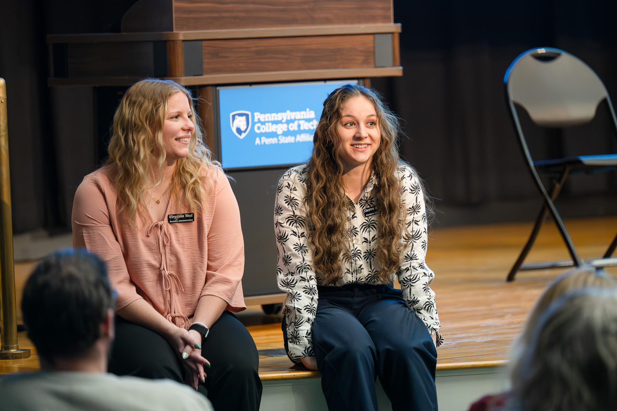 During a "Voices of Entrepreneurship" event developed and managed by Penn College business administration students, Erin S. Shultz, manager of LaunchBox operations (left) and Chelsea Blair, a business consultant for the Penn State Small Business Development Center, discuss the resources available to those on campus and in the community who want to start or expand a small business.