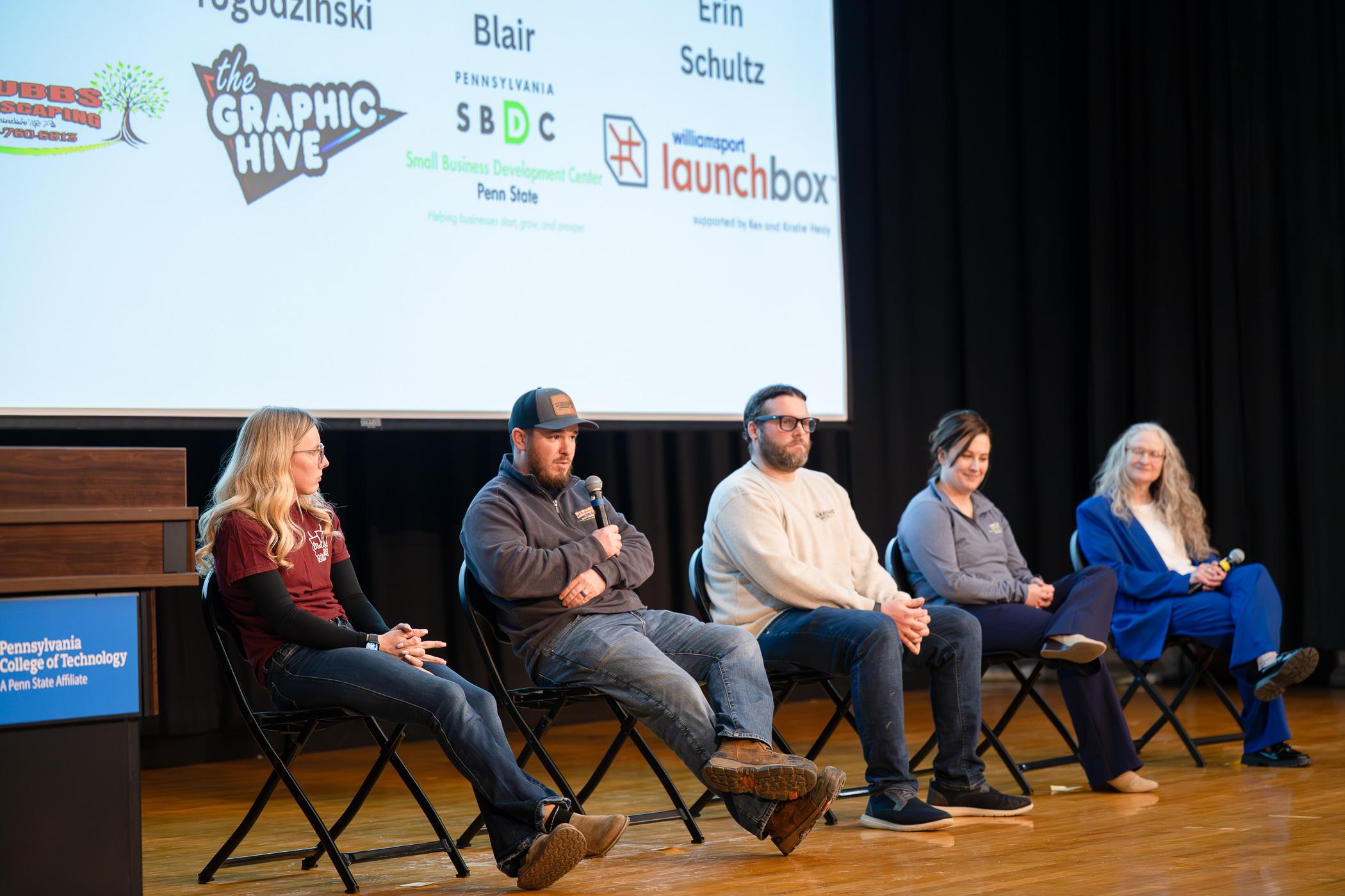 Penn College “Voices of Entrepreneurship” presenters answer a wealth of student questions. From left: Melyce E. Kenyon ’17, Justin M. Rinehimer ’17 and ’18, John Yogodzinski ’07, Chelsea Blair and Erin Shultz.