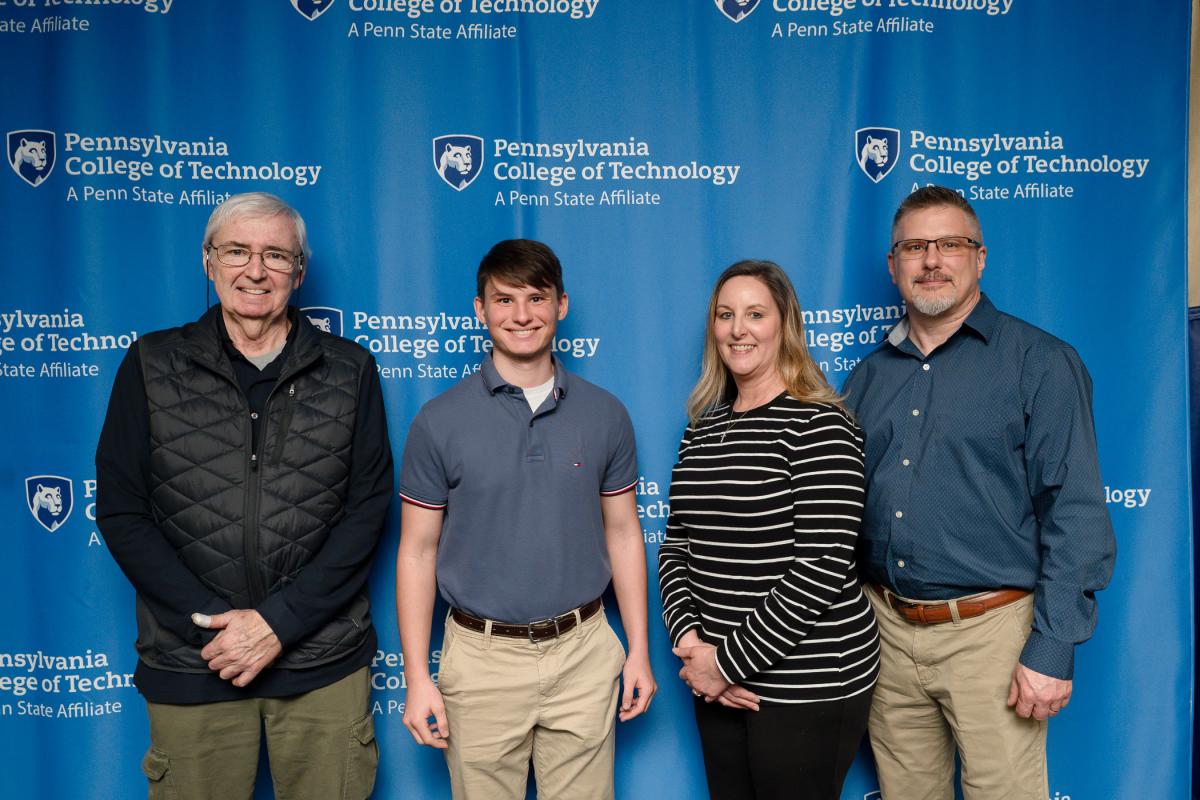 Retired faculty member Kenneth C. Kuhns (left) capitalizes on a photo opportunity with Ken and Diana Kuhns Scholarship recipient Aidan C. Gonya (second from left), an electronics & computer engineering technology student from Allentown, and his parents, Mary and Jim.