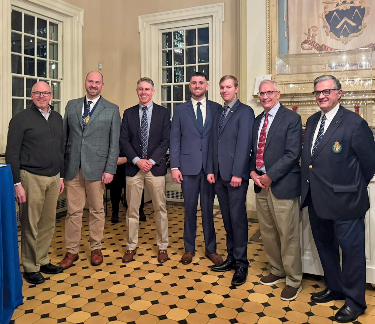 Pennsylvania College of Technology student and Robert Smith Memorial Scholarship recipient James C. Fretz (third from right), of Collegeville, joins members of the St. Andrews Society of Philadelphia and The Carpenters’ Company of the City and County of Philadelphia during the Robert Smith Birthday Celebration in historic Carpenters’ Hall. From left: John McDonald III, first vice president of the St. Andrew's Society; Richard Pagano, president of the St. Andrew’s Society; Adam Brown, St. Andrew’s Society member; scholarship recipients Patrick Kiely and Fretz; Robert Hudson, St. Andrew’s Society and Carpenters’ Company member; and John-David Franklin, St. Andrew’s Society member. (Photo provided)