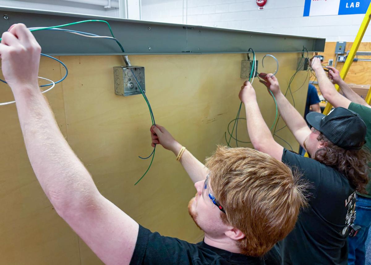 Electrical construction students Brett M. Russell, of Frackville, and Connor D. Lindsey, of Coraopolis, run wire for lab stations’ receptacle circuits.