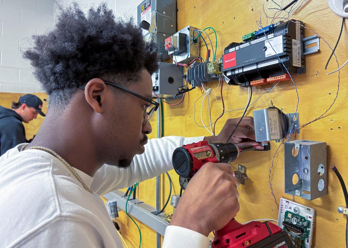 Marcello A. Santora, of Haskell, New Jersey, majoring in building automation engineering technology at Pennsylvania College of Technology, runs the control power wire for a thermostat. Santora is one of about 30 Penn College juniors installing Honeywell equipment for an updated building automation lab at the school. Once completed, the space will have 45 individual stations for students.