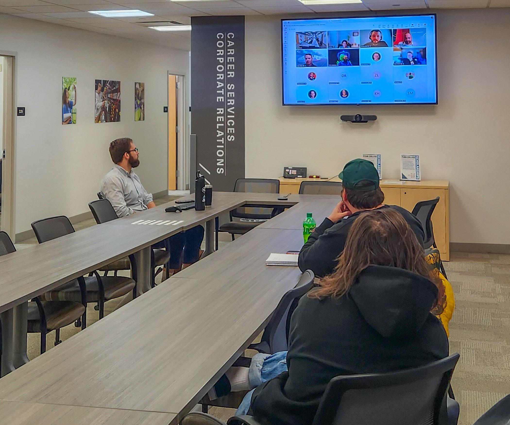 In Penn College's Center of Career Design, faculty member Rick Crossen (left) serves as moderator for a virtual meeting with information technology alumni and students. (Photo provided)