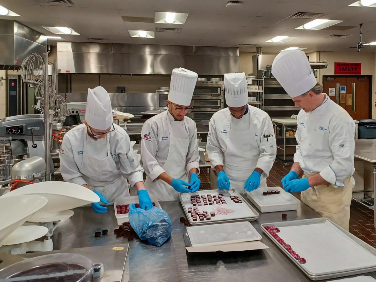 While they packed bonbons that they will transport to Kentucky for a sumptuous “chocolate experience” in two of Churchill Downs’ most exclusive dining and race-viewing venues, Aucker interviewed baking & pastry arts students Ronald L. Bryant, of Farmington, and Amanda N. Wetzel, of Hanover, as well as culinary arts technology student Tyler S. Cressman, of Reading, and Chef Charles R. Niedermyer, instructor of baking & pastry arts/culinary arts, who has been taking Penn College students to the Kentucky Derby for more than 15 years.