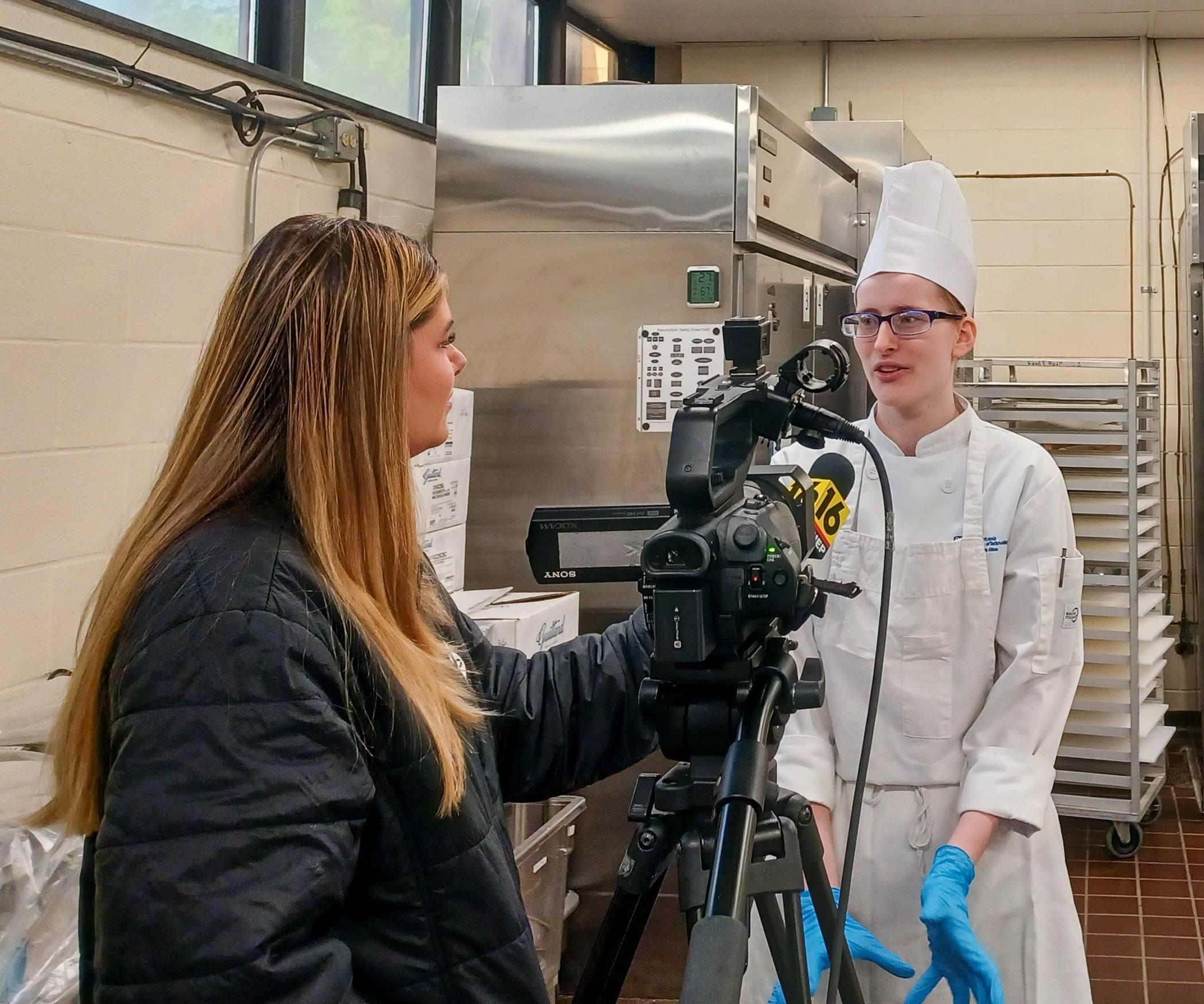 WNEP-TV journalist Mackenzie Aucker visited a Penn College baking lab on Wednesday to interview students and faculty who will help provide a deluxe dining experience to spectators at Churchill Downs during the famed Kentucky Derby.