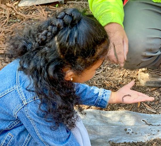 Children gather to get a close-up of an earthworm in Myers' hand.