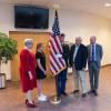 Student Natascha G. Santaella, of Williamsport, and Gary T. Pandolfi, refrigeration, heating and plumbing mechanic, send color coursing through the Veterans' Fountain. Student leaders outside the Breuder Advanced Technology & Health Sciences Center, with the newly tinted fountain spraying behind them, are (from left) Santaella; Everett B. Appleby, of Wilkes-Barre; David A.