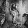Highly regarded – literally! – for his eye-grabbing work on campus, Stabley plays to the admiring crowd below. The artist (center) describes his process. A guest snaps a cellphone photo of the work-in-progress, shown on one of the atrium’s monitors. Stabley points out the intricacy of his creation's colored glass tiles.