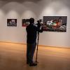 An array of technology is visible – including in the hands of Adam J. Miller, manager of instructional media production, who captures footage of the exhibit. A group of engaged graphic design students oblige a photographer’s request at the exhibit’s title wall. In front of a color-rich creation, May discusses her process.