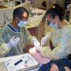 Savanna R. Stauffer, a physician assistant student from Ephrata, draws a dose of the vaccine into a syringe. PA student Bryce A. Petersheim, of Birdsboro, administers a flu shot to Francis J. Quigley, an engineering design technology student from Coatesville. After a reportedly pain-free injection, physician assistant student Jessica A.