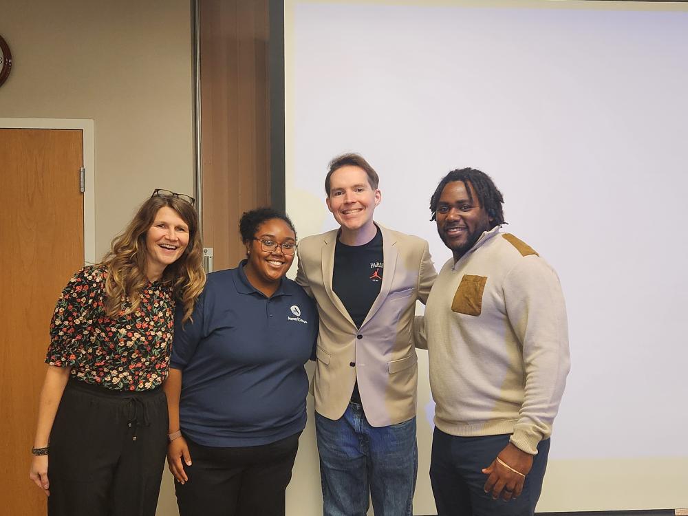 Kerry poses with Penn College students and staff. Left to right: Katie Mackey, Assistant Director of Disability & Access Resources; Chyanna Galagarza, Human Services & Restorative Justice student and AmeriCorps Service member; Kerry Magro, Presenter; and Nate Woods, Special Assistant to the President for Inclusion Transformation.
