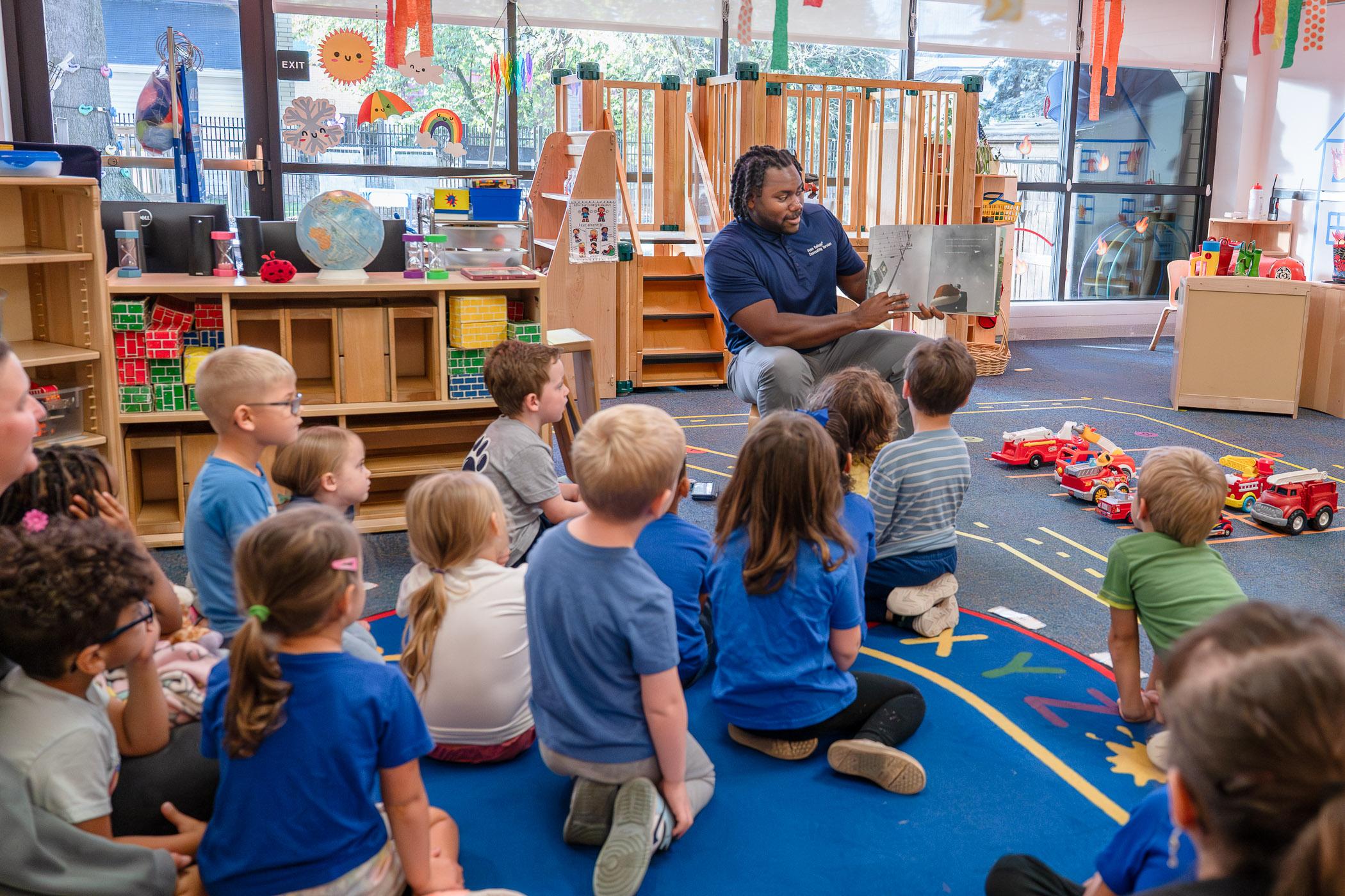 Dr Wood reading a book to young children seated on a classroom rug